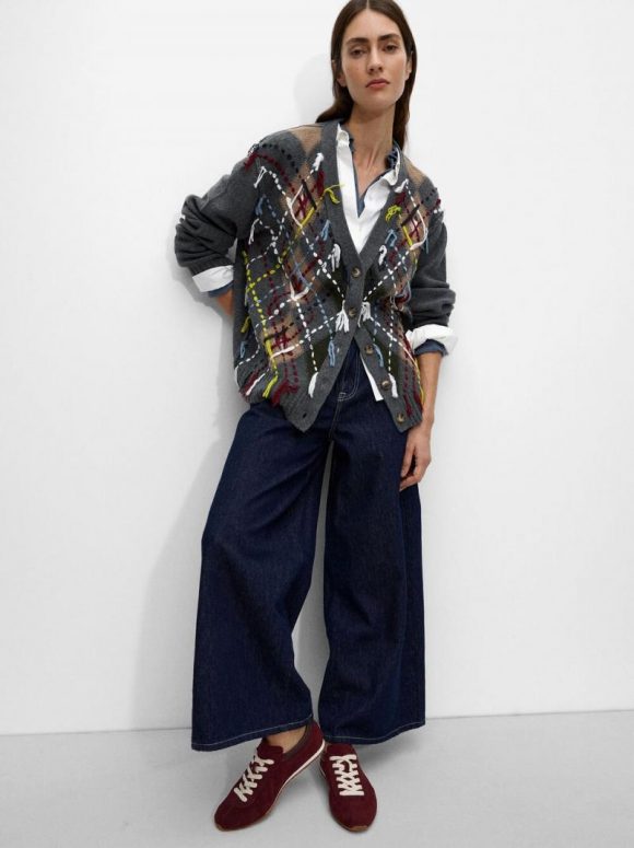 Cárdigan de punto Jacquard con lana. Diseño de rombos. Cierre con botones. Cuello en V. Manga larga. Bordado a mano. La modelo mide 1,76 m y lleva la talla XS-S.
