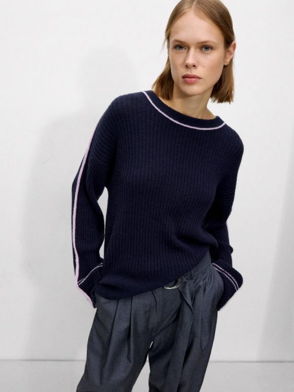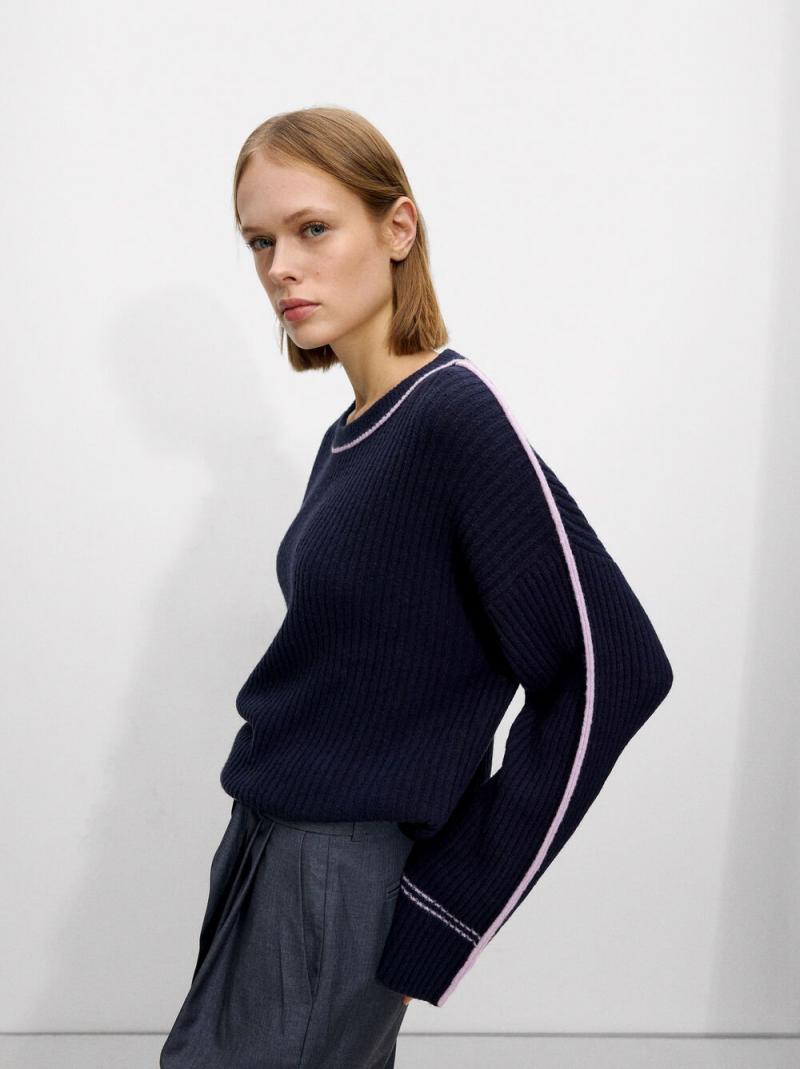 Jersey de punto canalado con lana. Manga larga. Cuello redondo. Detalle de línea en contraste. La modelo mide 1.77 m y lleva la talla XS-S.