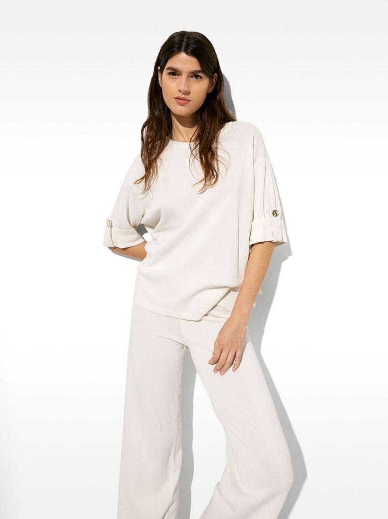 Camisola de punto de manga corta, con detalle de botón en el dobladillo. Cuello redondo. La modelo mide 1.76 m y lleva la talla XS-S.