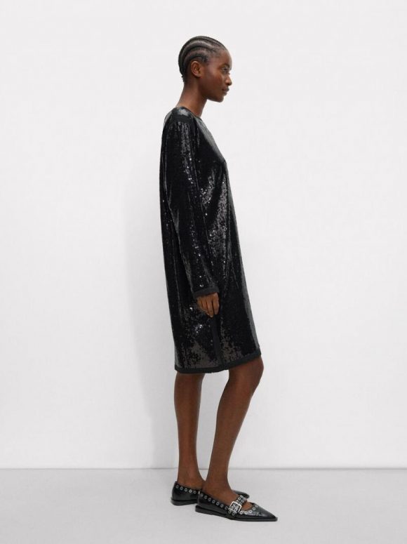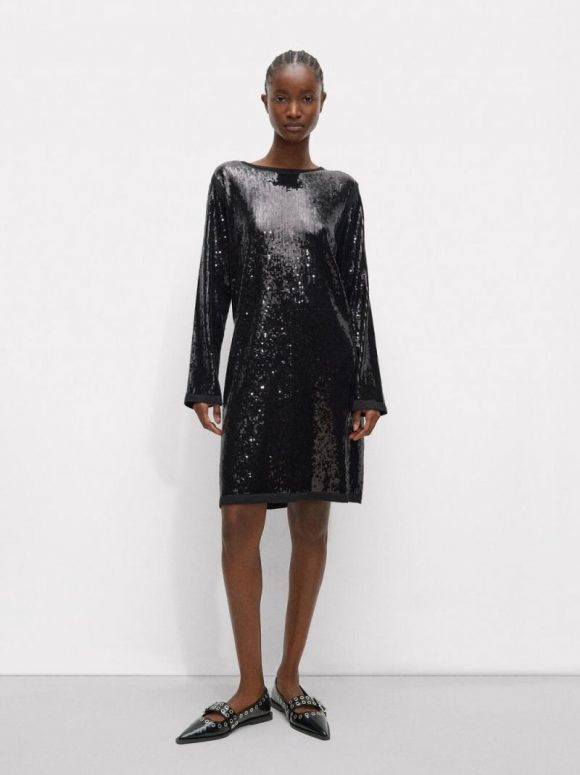 Vestido corto con lentejuelas y lana. Escote redondo. Manga larga. La modelo mide 1.76 m y lleva la talla XS-S.