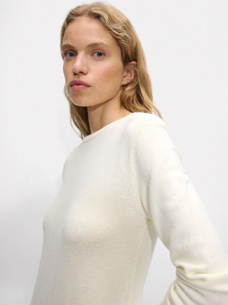 Vestido largo de punto. Manga larga. Escote redondo con detalle canalado. La modelo mide 1.77 m y lleva la talla XS-S.