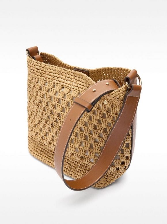 Bolso de hombro con perforaciones y efecto rafia. Forro interior extraíble con cierre de cremallera. Cierre principal con imán. Asa fija regulable.