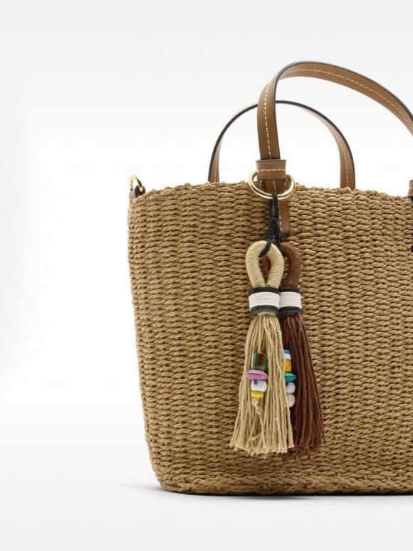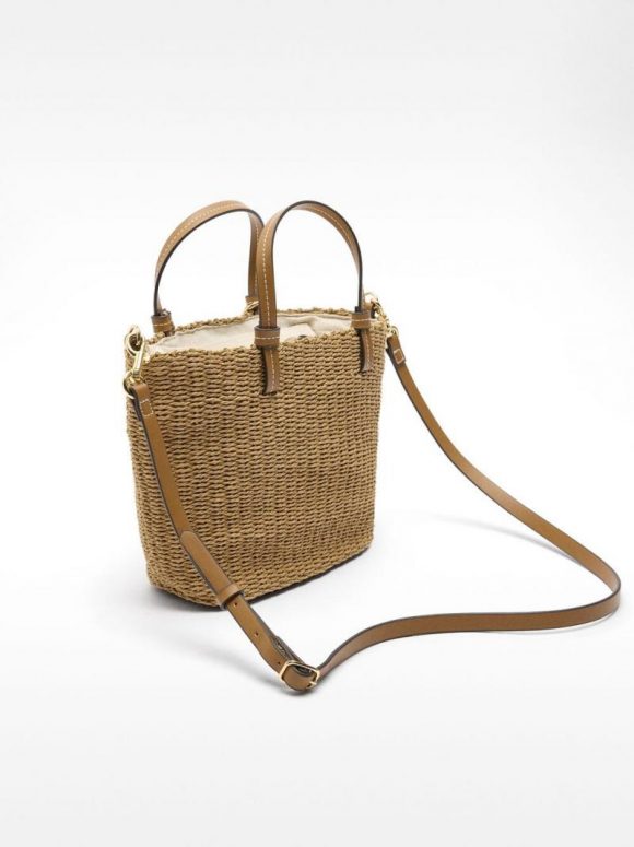 Bolso tote efecto rafia. Forro interior y bolsillo. Cierre de cremallera. Asas de mano fijas. Colgante removible. Incluye asa bandolera.