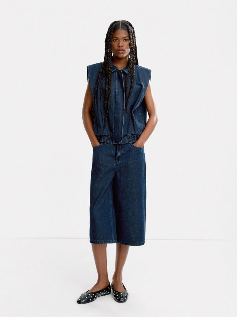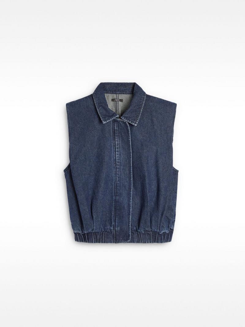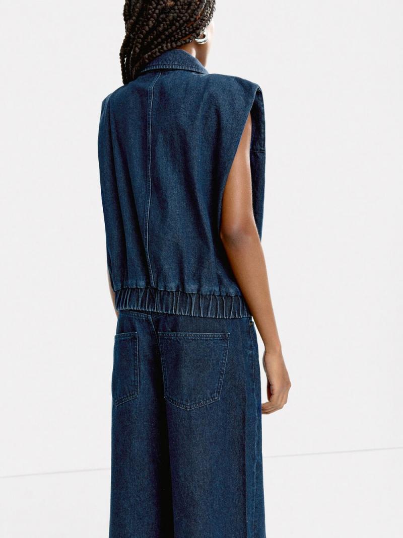 Chaleco en denimestilo bomber. Cuello de solapa. Sin mangas. Costura marcada en la parte posterior. Detalle de elástico en el dobladillo. La modelo mide 1,75 m y lleva la talla S.