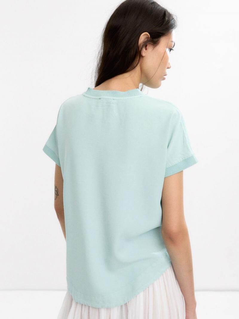 Top liso con detalles canalados en los bordes. Cuello redondo. Manga corta.