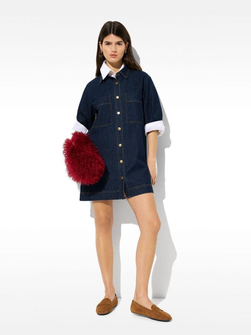 Vestido corto denim. Cuello de solapa. Mangas 3/4 con ribete en color contrastante. Bolsillos laterales. Cierre con botones a presión. La modelo mide 1,77 m y lleva la talla S.