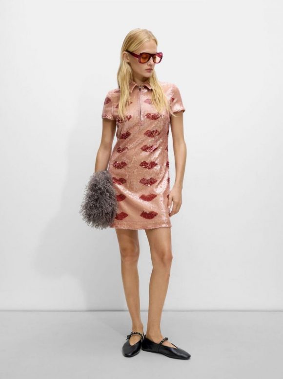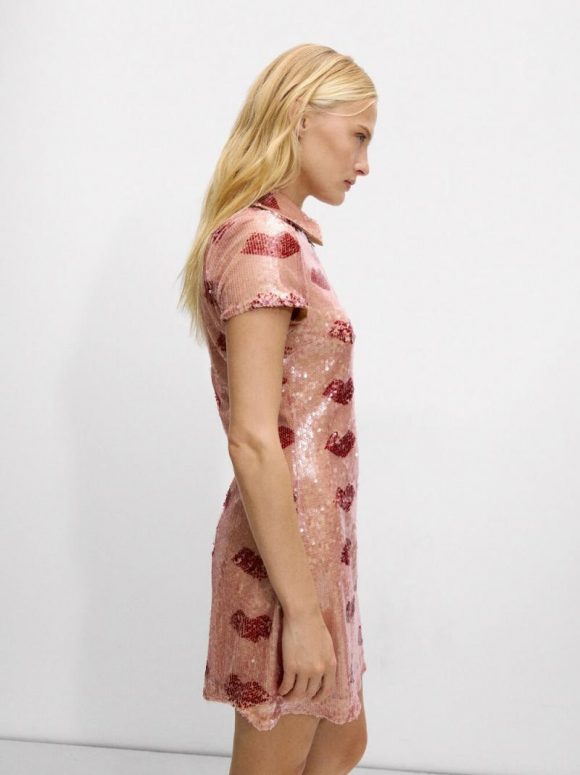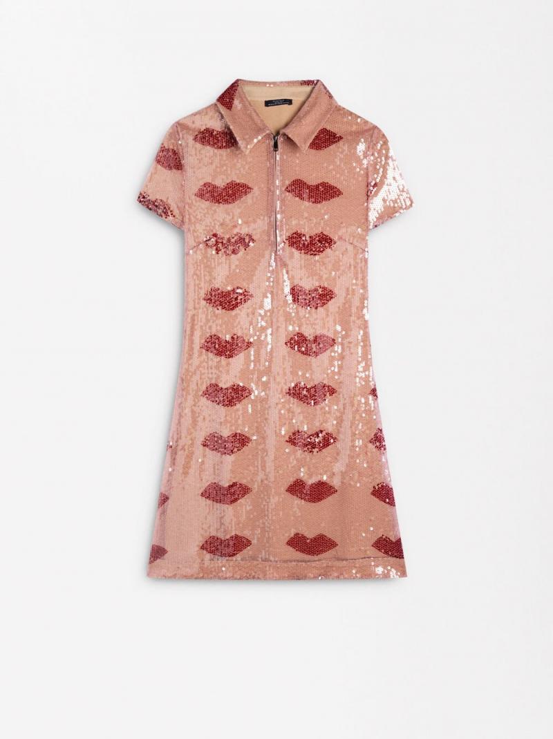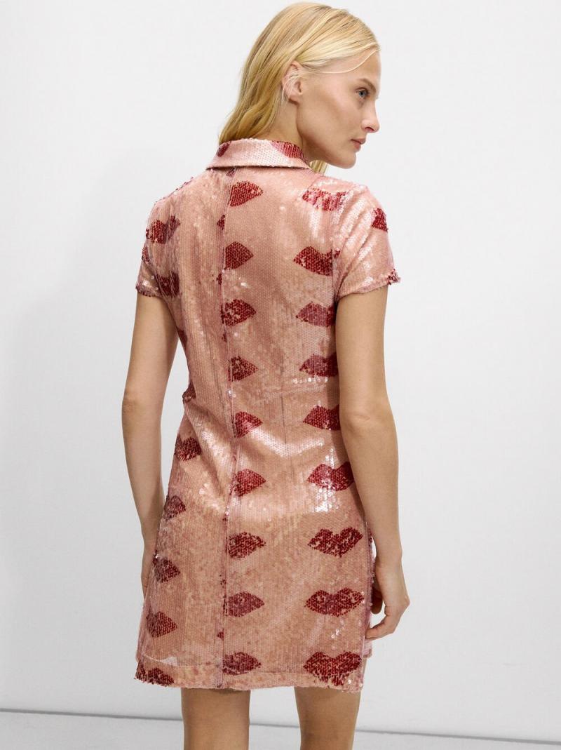 Vestido corto estampado con lentejuelas. Cuello polo. Manga corta. Cierre frontal superior con cremallera. La modelo mide 1,72 m y lleva la talla XS-S.