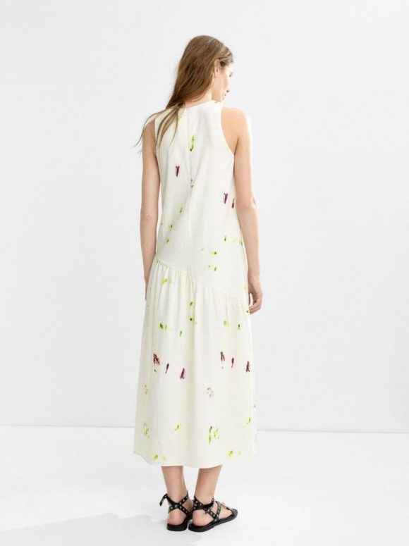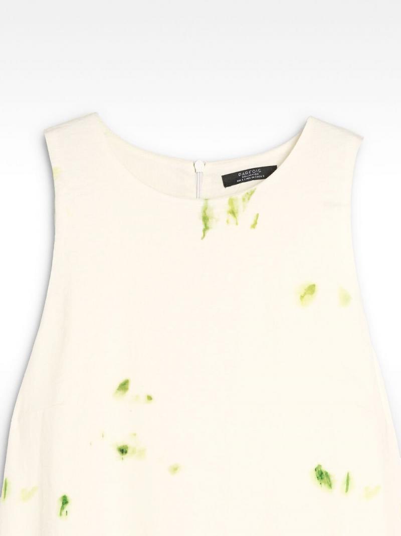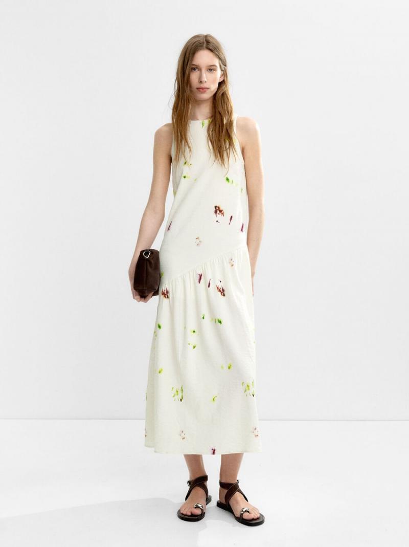 Vestido midi con estampado. Cuello redondo. Sin mangas. Costuras laterales visibles con detalle fruncido. La modelo mide 1,79 m y lleva la talla S.