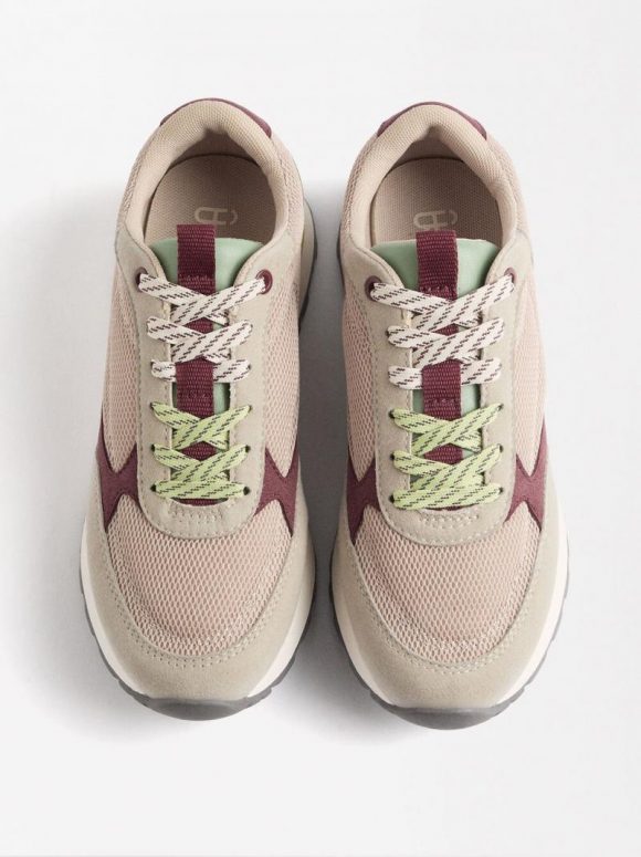 Zapatillas con varios colores y texturas contrastantes. Dos pares de cordones bicolores en armonía con el diseño del calzado. Puntera redonda. Suela de goma.