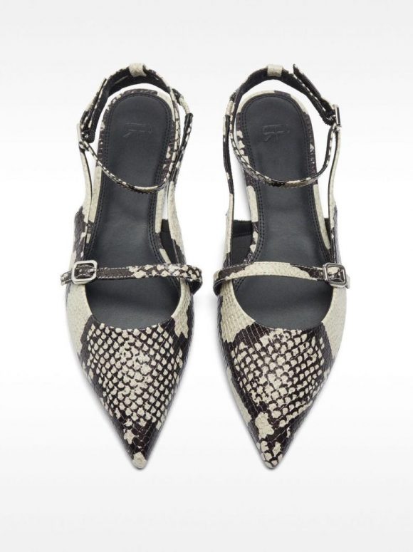 Bailarinas destalonadas con estampado animal. Tiras ajustables con hebilla, en el empeine y el tobillo. Acabado en punta. Suela de goma.